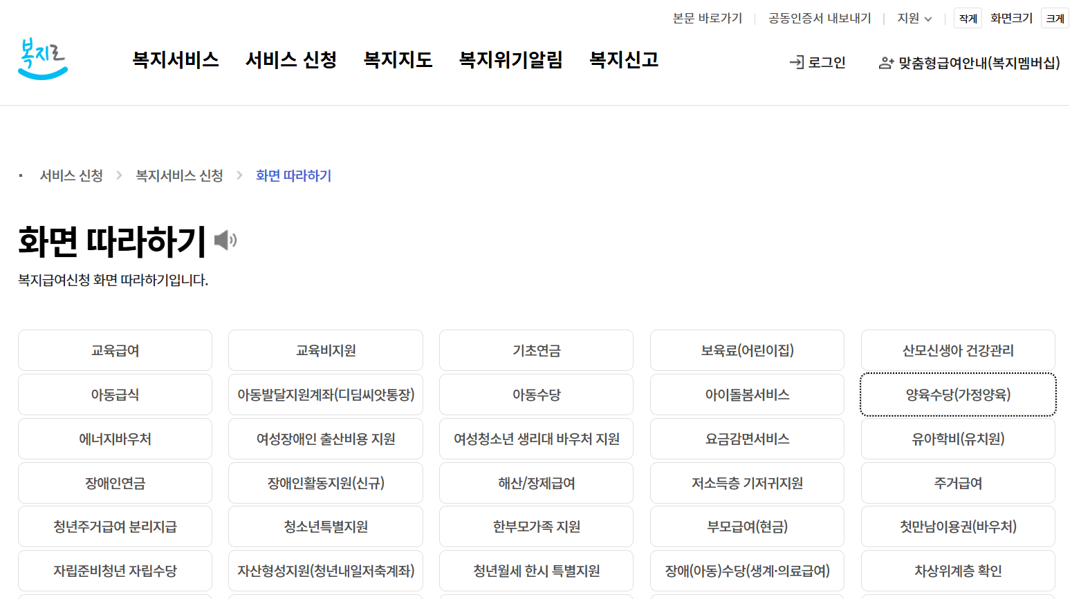 • 복지서비스 신청 탭에 화면 따라하기 클릭