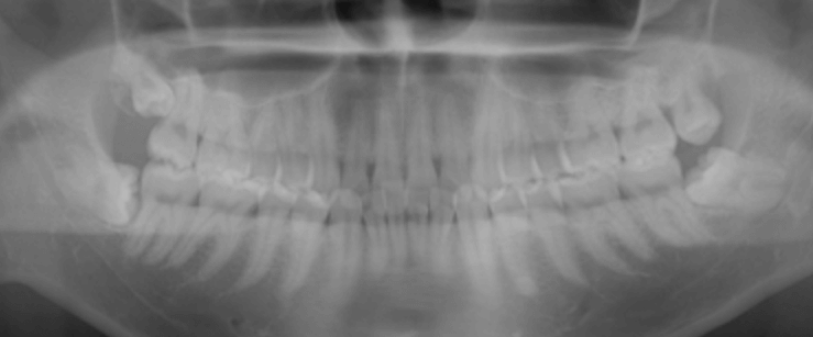 사랑니가 앞쪽 치아 방향으로 기울어진 상태입니다. 가장 흔한 사랑니 매복 유형으로 제2대구치를 향해 각도를 이루고 있습니다.