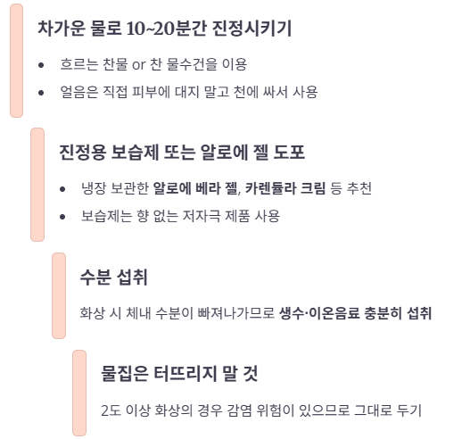 - 화상 시 체내 수분이 빠져나가므로 생수·이온음료 충분히 섭취