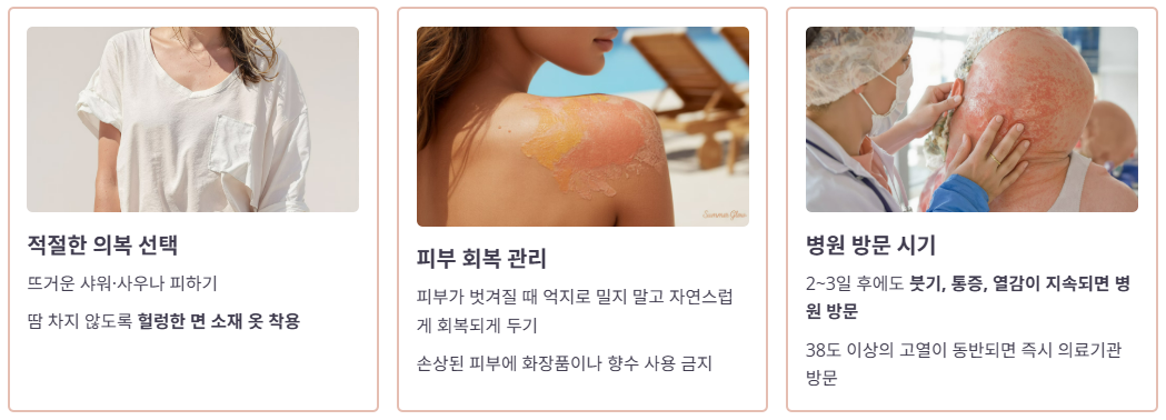 여름철엔 자외선 차단제긴 소매 옷으로 예방하고, 화상 발생 시엔 빠른 진정과 감염 예방이 핵심이에요!