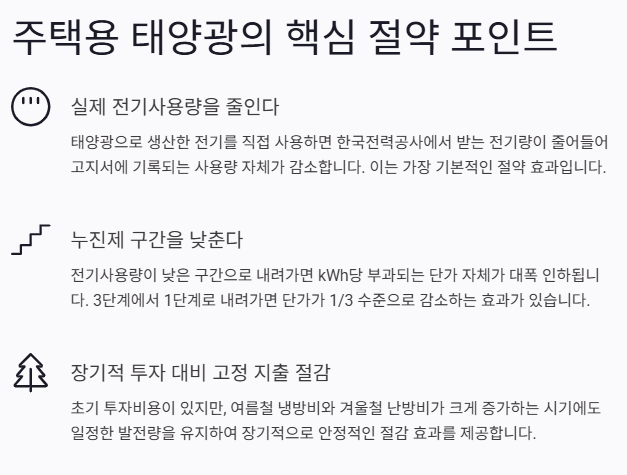 주택용 태양광은 직접 전기를 생산하여 내가 쓴 전기량에서 차감되므로, 고지서상 전기사용량을 줄이는 직접적인 효과가 있습니다.