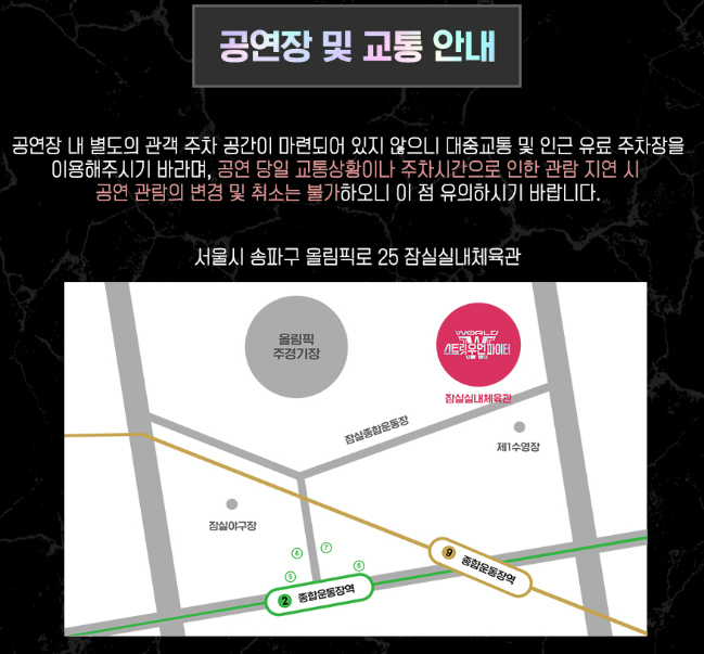 공연장인 잠실실내체육관의 주차장이 별도로 마련되어 있지 않으니 대중교통이나 인근 유료 주차장을 이용하셔야 합니다.