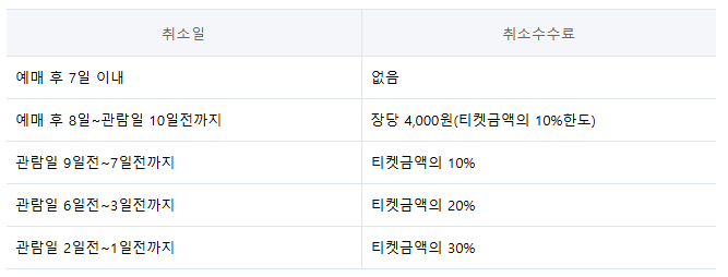 예매 당일 밤 12시 이전 취소 시에는 취소수수료가 없으며, 예매 수수료도 환불됩니다.(취소기한 내에 한함)