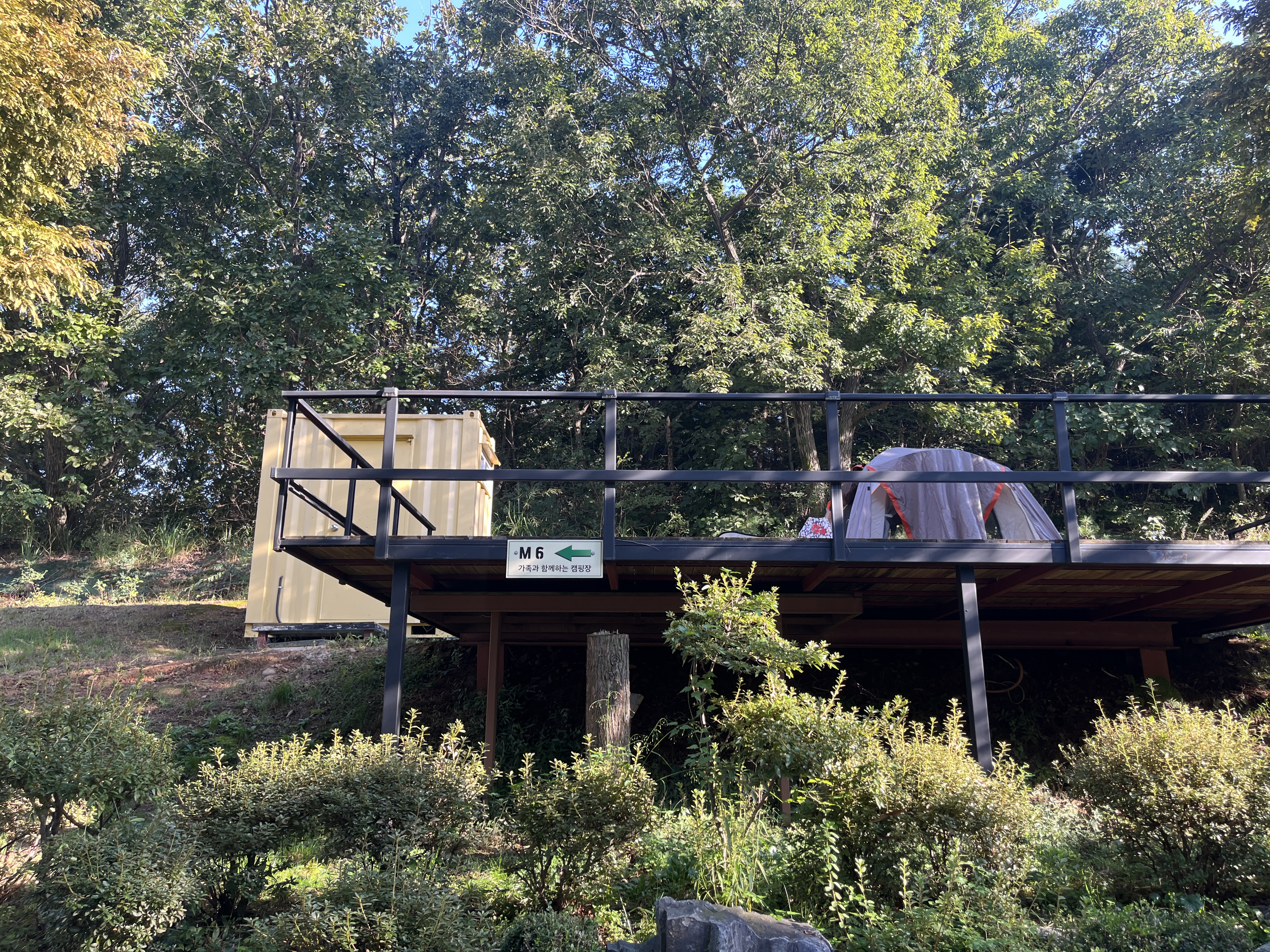김포캠핑파크는 사진처럼 마운틴데크 사이트라고, 개별 화장실이 딸린 사이트가 있어요. 당연히 인기가 좋아 예약하기 힘들고 화장실 안에를 살짝보니 깨끗해보이더라고요. 가격도 일반 사이트에 비해 1.5배 정도 비싸요. 사이트 간격이 좁고 매너타임 관리가 잘 되지 않아 조금 불편한 점도 있었어요. 우리가 예약한 T71 사이트는 구석쪽이라 상대적으로 조용했지만, 전체적으로 보면 캠핑장 분위기가 꽤 시끄러웠어요.