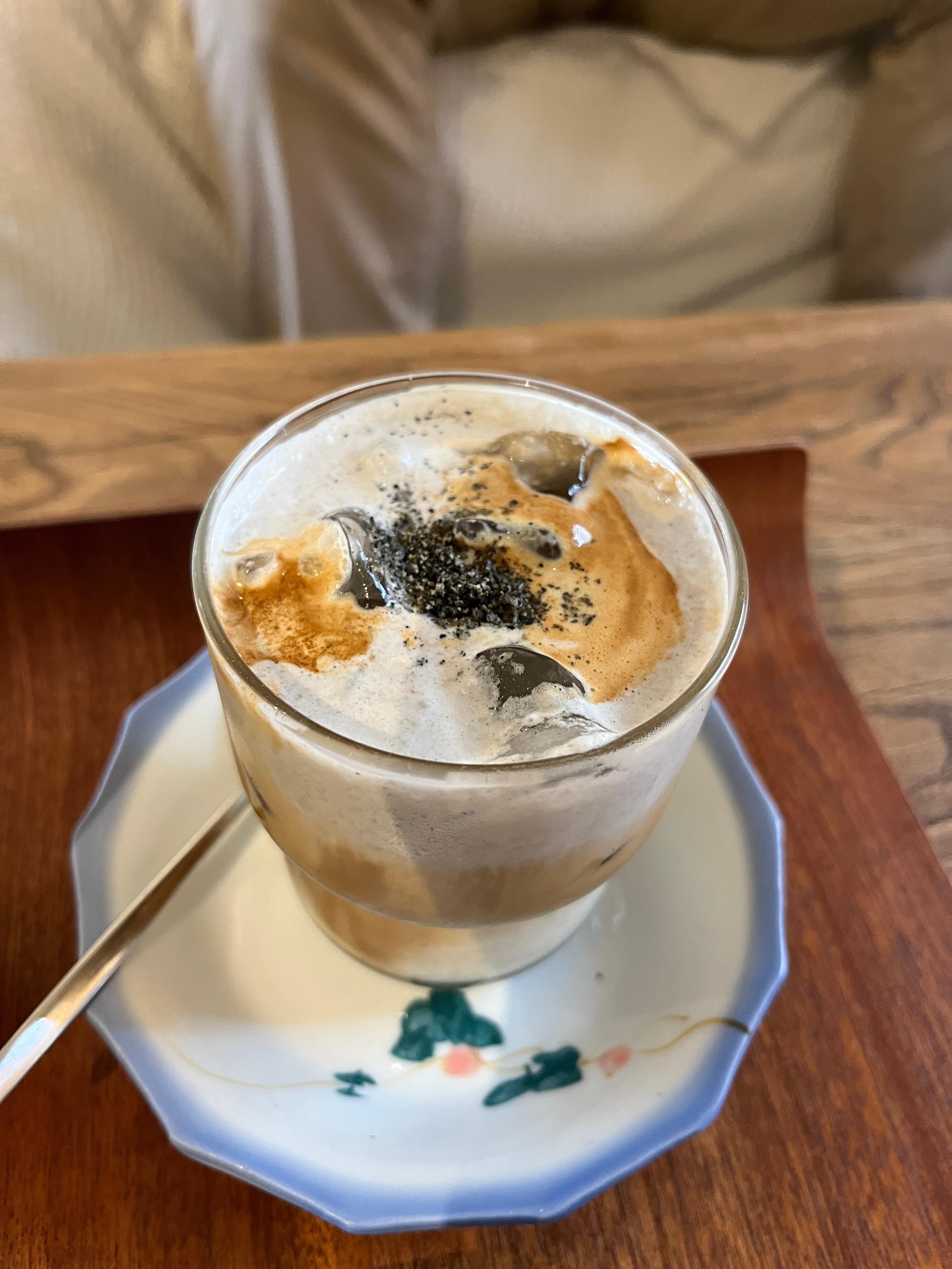 시그니쳐인 흑임자커피에요 위에 흑임자크림을 올려주는데 아인슈페너같은 커피였어요