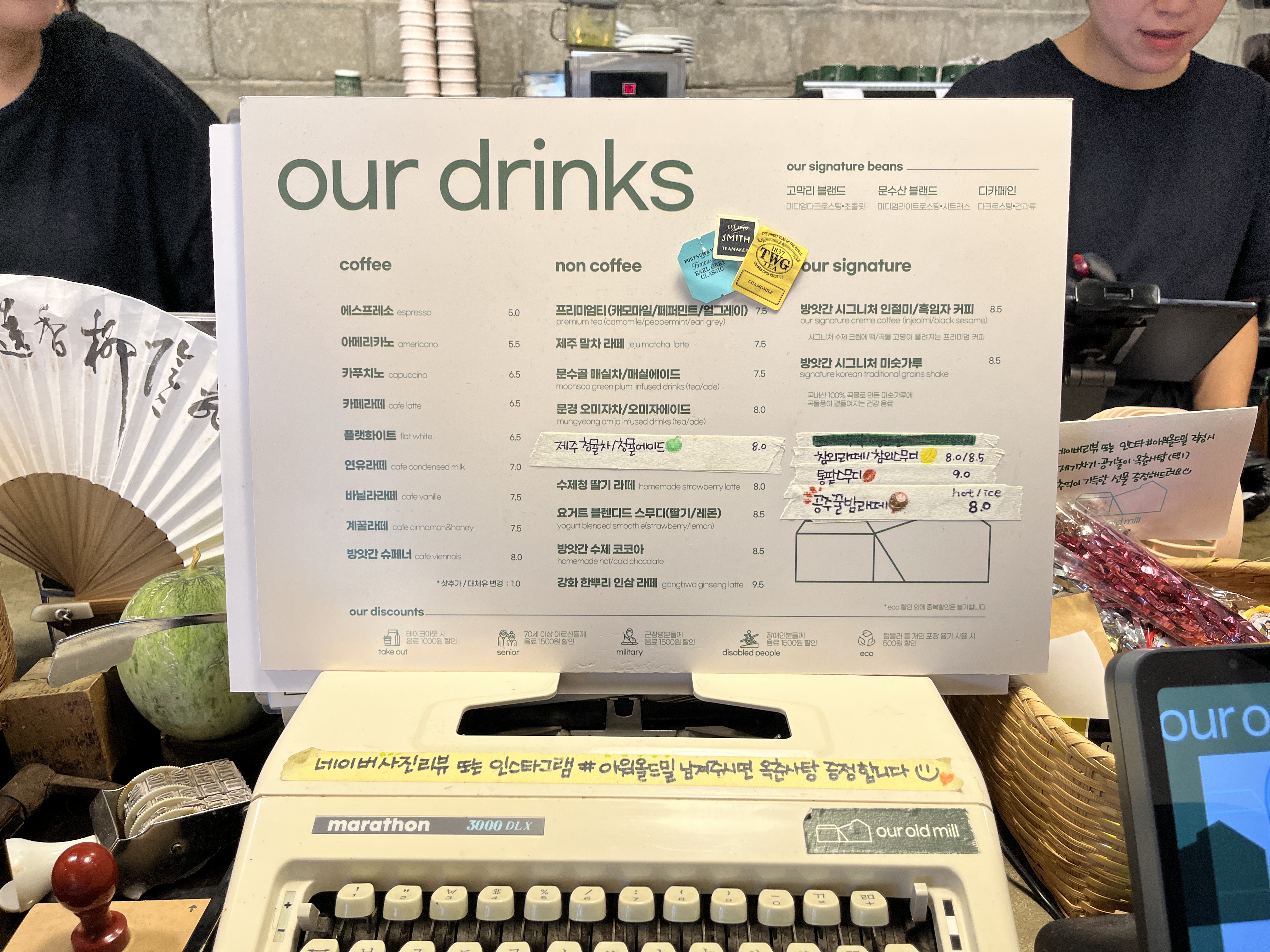 아워올드밀의 메뉴에요 새로운 카페를 와봤으니 또 시그니쳐 음료를 먹어봐야죠
