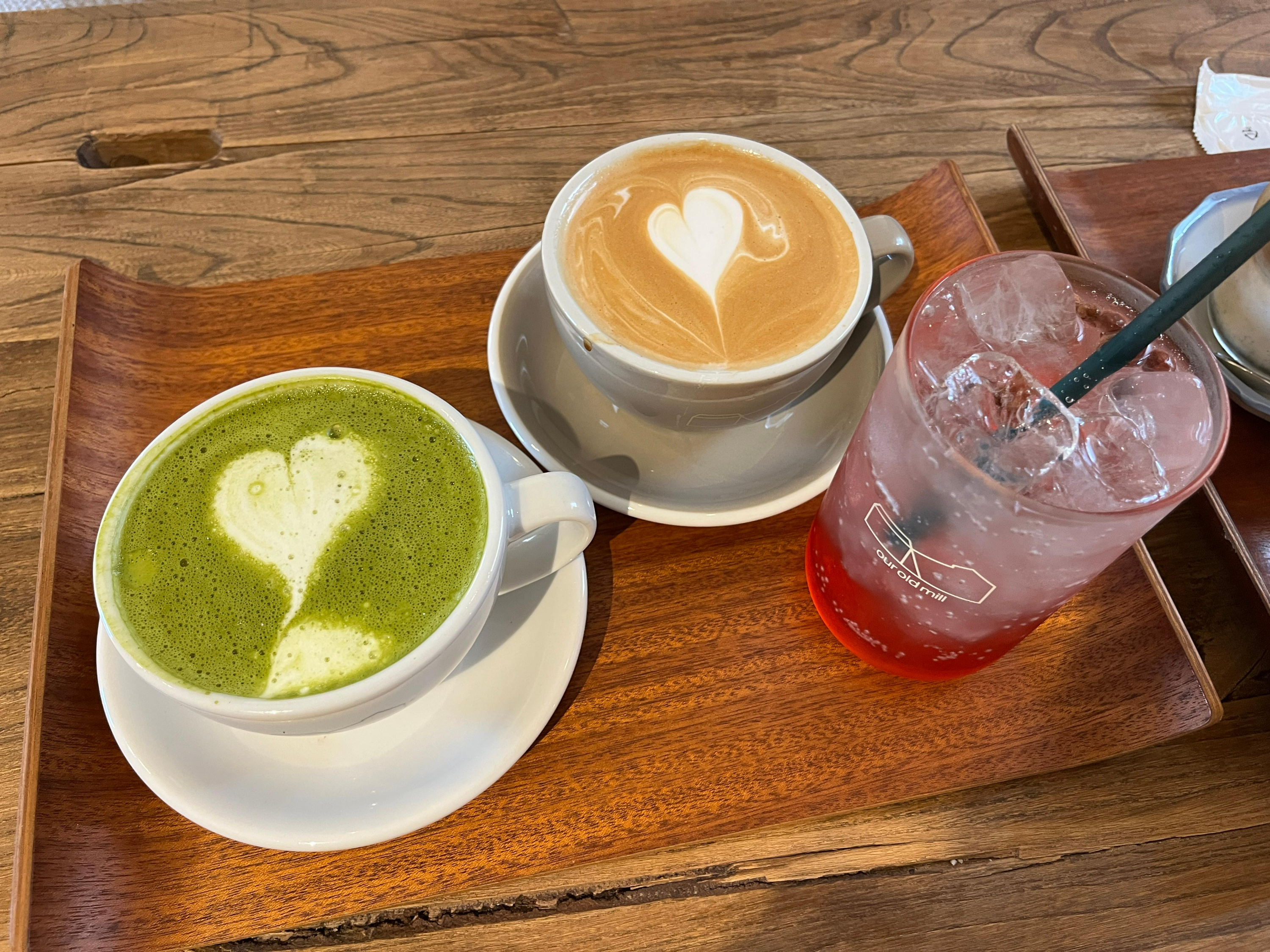 녹차라떼, 라떼, 오미자에이드에요 라떼아트도 아주 이쁘게 잘 만들어주시고 잔도 귀여웠어요