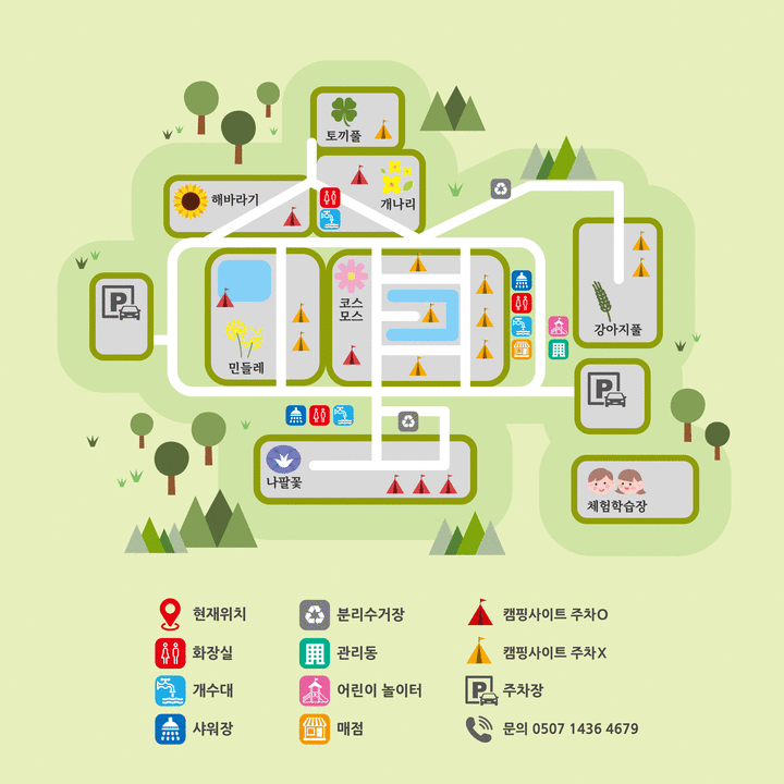 파주 캠핑장 배나무꽃 캠핑장은 사이트가 다양한데 밑에 사진에 나와있는 것처럼 코스모스, 토끼풀, 개나리, 해바라기, 민들레, 강아지풀, 나팔꽃 이렇게 7개 사이트가 있어요 총 7만평 규모의 캠핑장이라고 해요 알고보니 이곳이 원래 이름이 귀한농부학교더라구요! 애견동반 캠핑장이라 대지가 무지 넓어서 강아지를 동반한 가족들도 많았어요