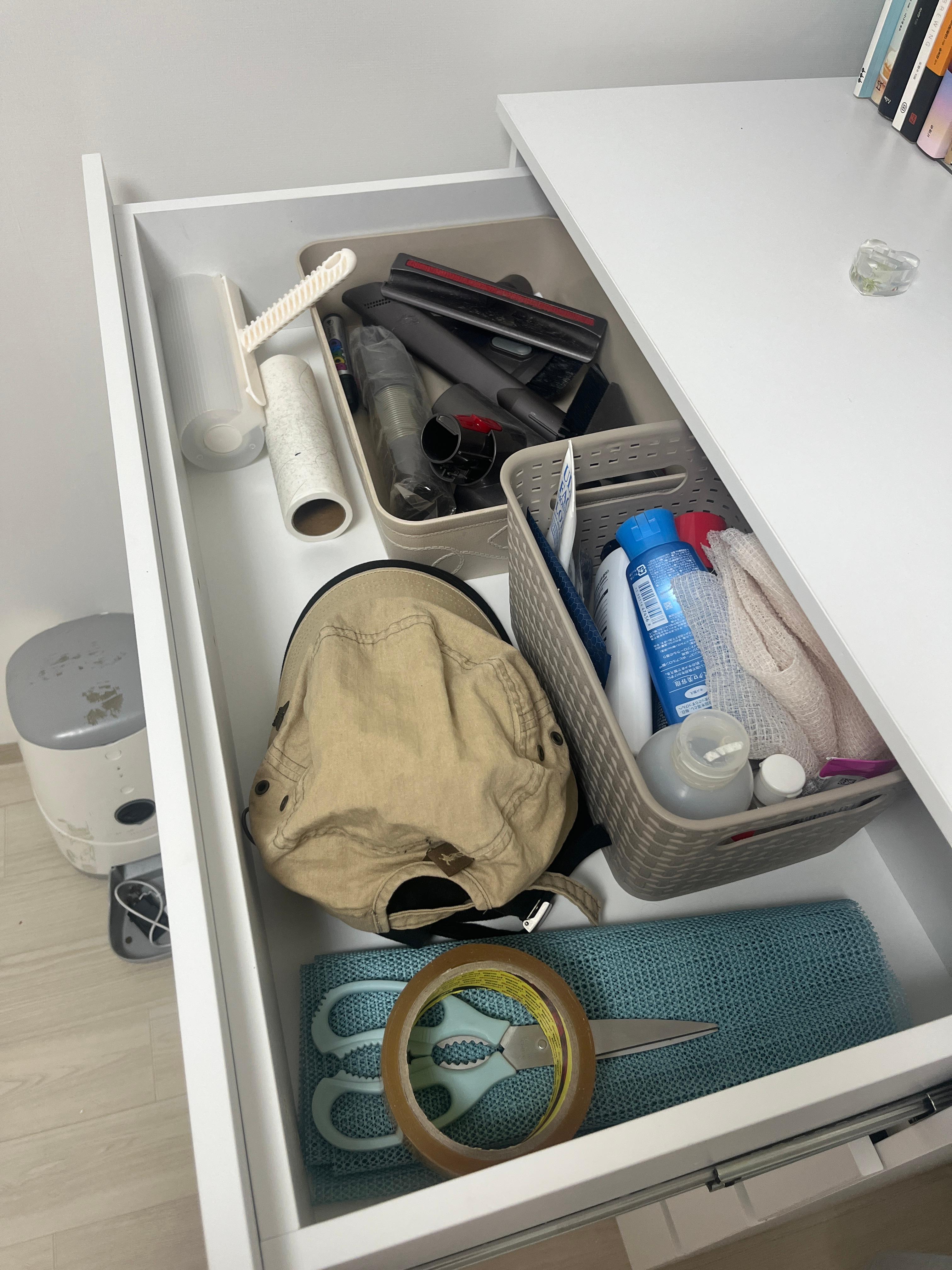 밑에 서랍에는 잘 안입는 옷이나 악세사리 등을 보관하고요 바닥 서랍에는 청소도구들을 보관하고 있어요
